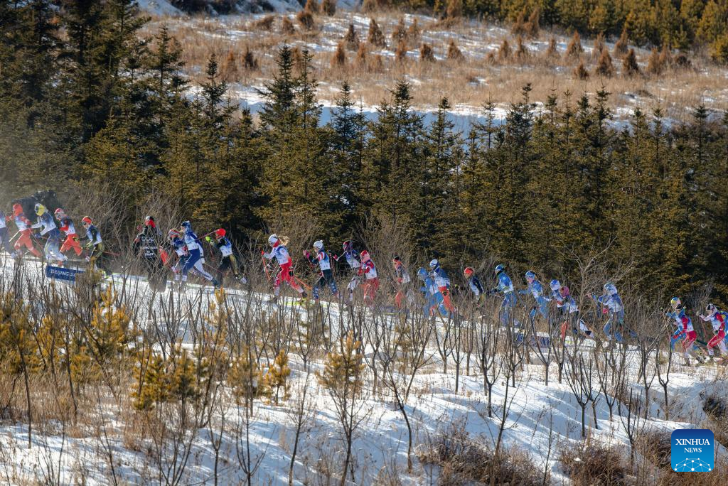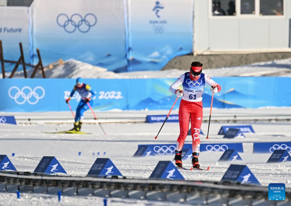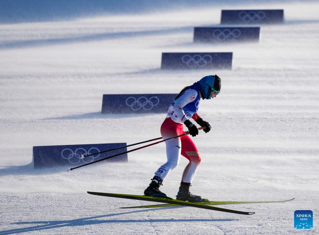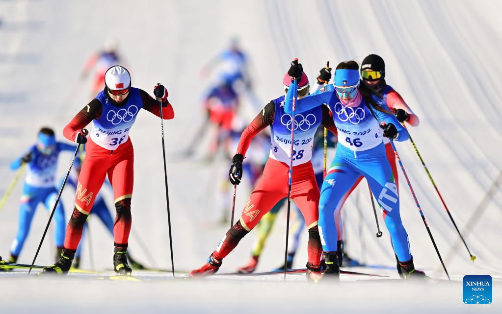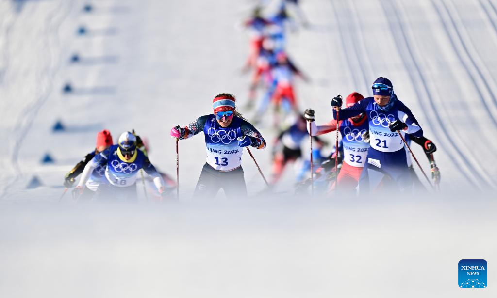 Athletes compete during the Cross-Country Skiing Women's 7.5km + 7.5km Skiathlon at National Cross-Country Skiing Centre in Zhangjiakou, north China's Hebei Province, Feb. 5, 2022. (Xinhua/Mu Yu)