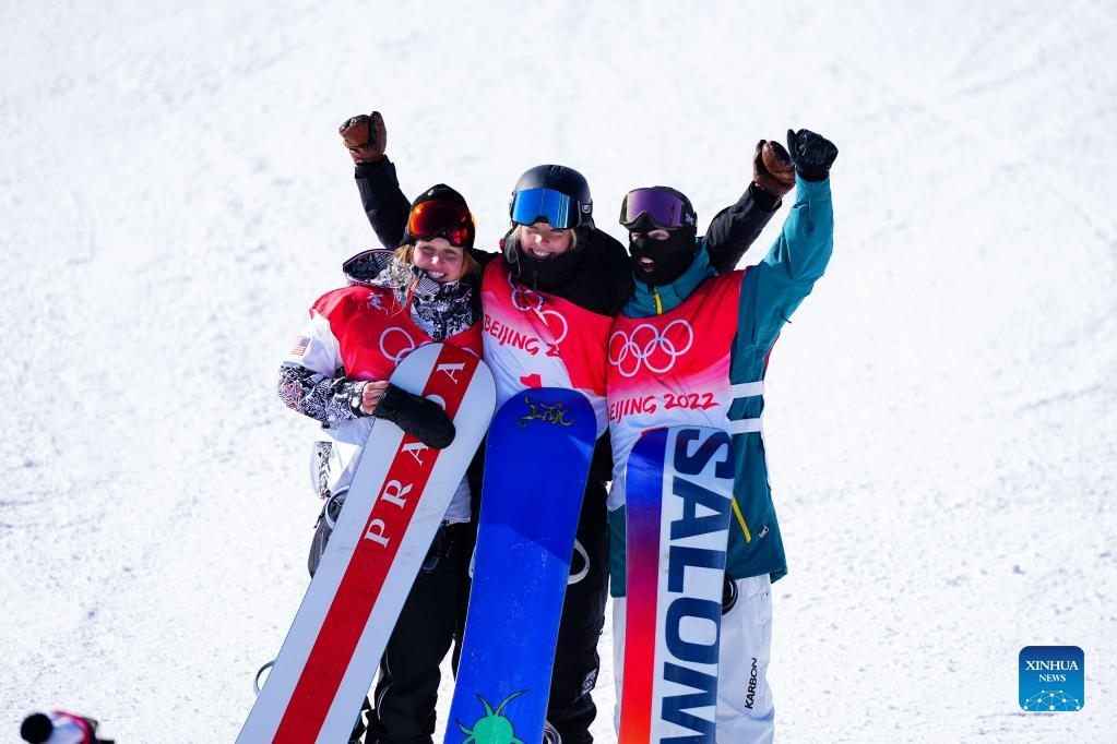 Zoi Sadowski Synnott (C) of New Zealand celebrates winning the women's snowboard slopestyle final at the Genting Snow Park in Zhangjiakou, north China's Hebei Province, Feb. 6, 2022. (Xinhua/Xue Yubin)