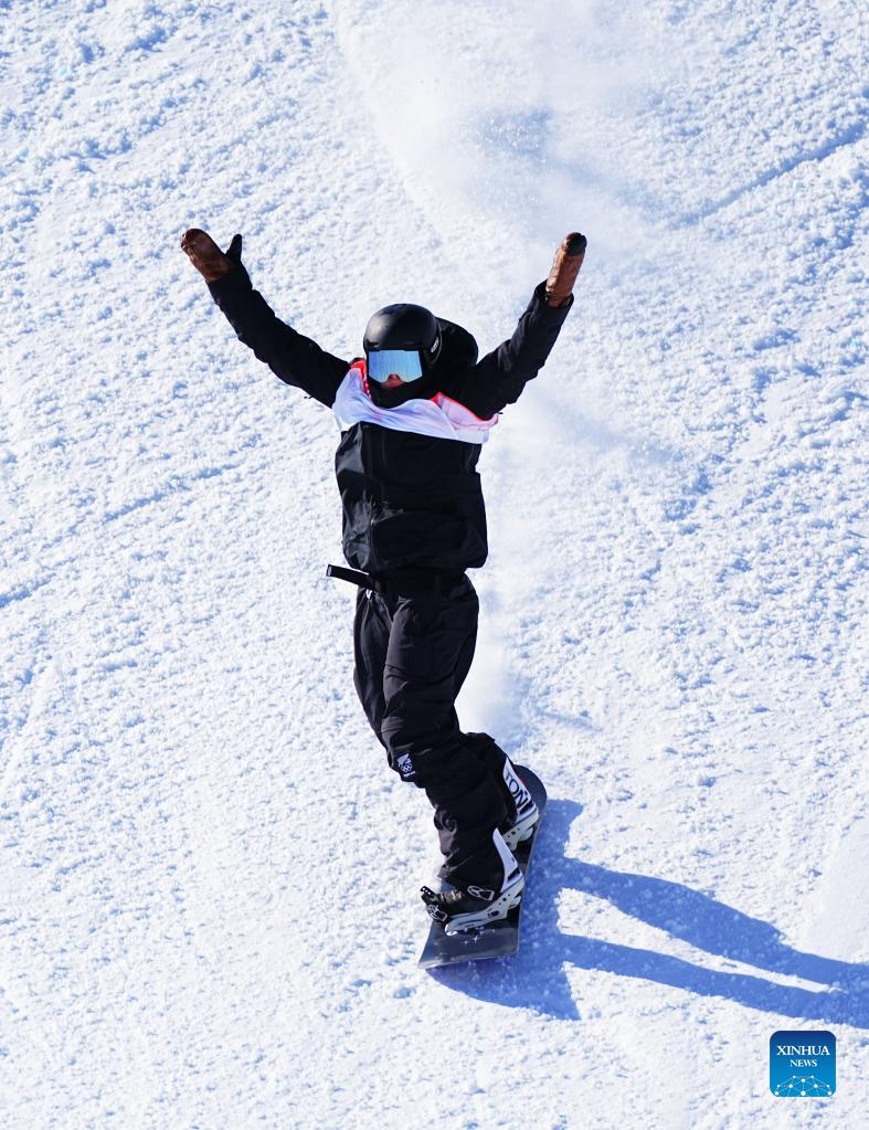 Zoi Sadowski Synnott of New Zealand celebrates winning the women's snowboard slopestyle final at the Genting Snow Park in Zhangjiakou, north China's Hebei Province, Feb. 6, 2022. (Xinhua/Xue Yubin)