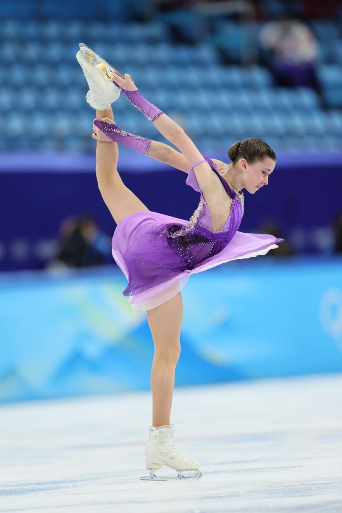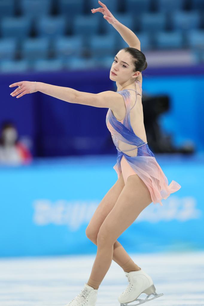 Kamila Valieva of ROC performs during the figure skating team event women's single skating short program match at Capital Indoor Stadium in Beijing, capital of China, Feb. 6, 2022. (Xinhua/Lan Hongguang)