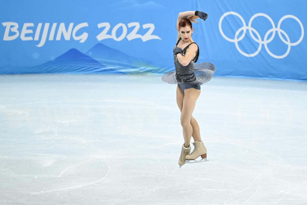 Eliska Brezinova of Czech Republic performs during the figure skating team event women's single skating short program match at Capital Indoor Stadium in Beijing, capital of China, Feb. 6, 2022. (Xinhua/Lan Hongguang)