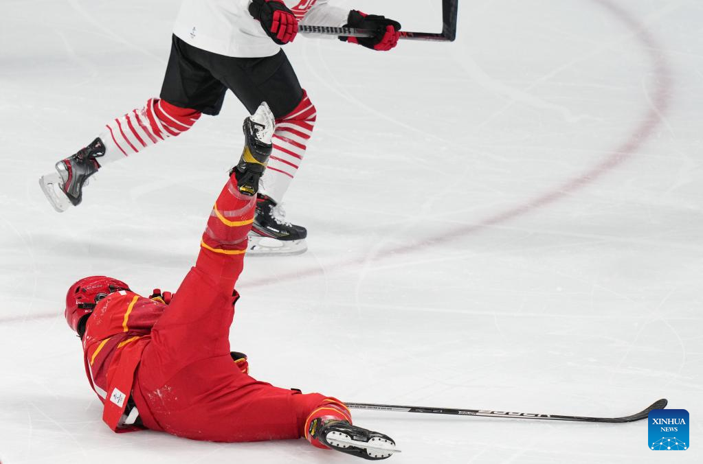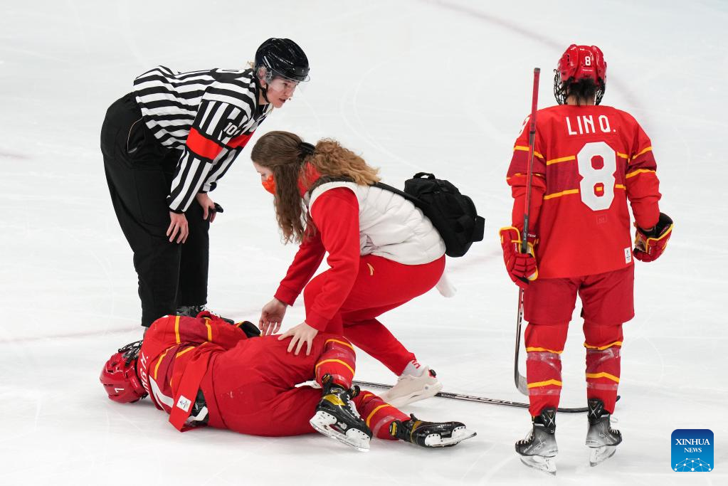 Zhang Mengying of China falls during the ice hockey women's Group B match between China and Japan at Wukesong Sports Centre in Beijing, capital of China, Feb. 6, 2022. (Xinhua/Meng Yongmin)