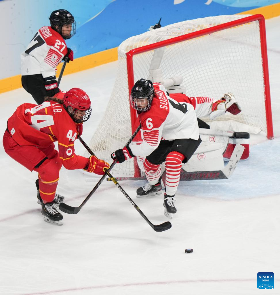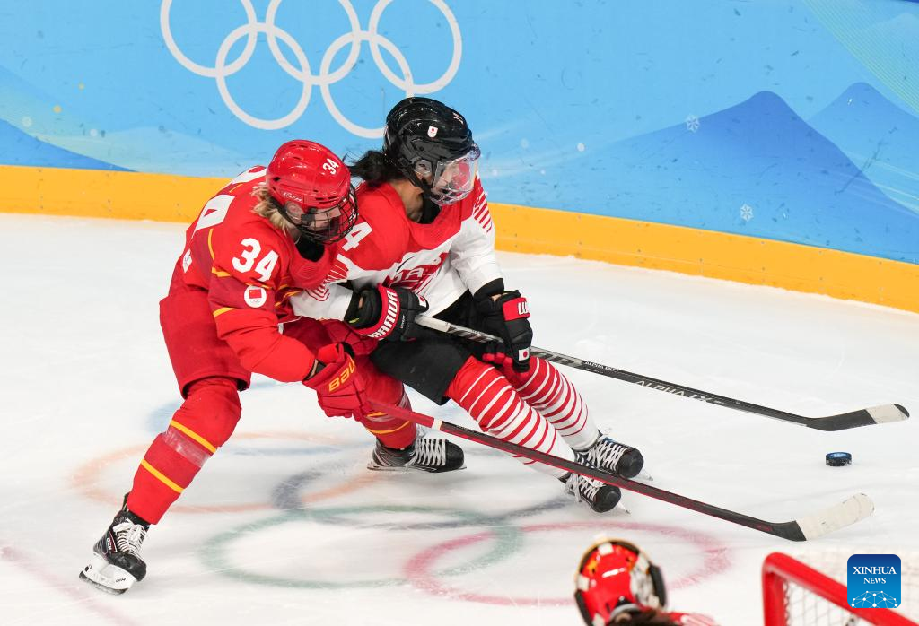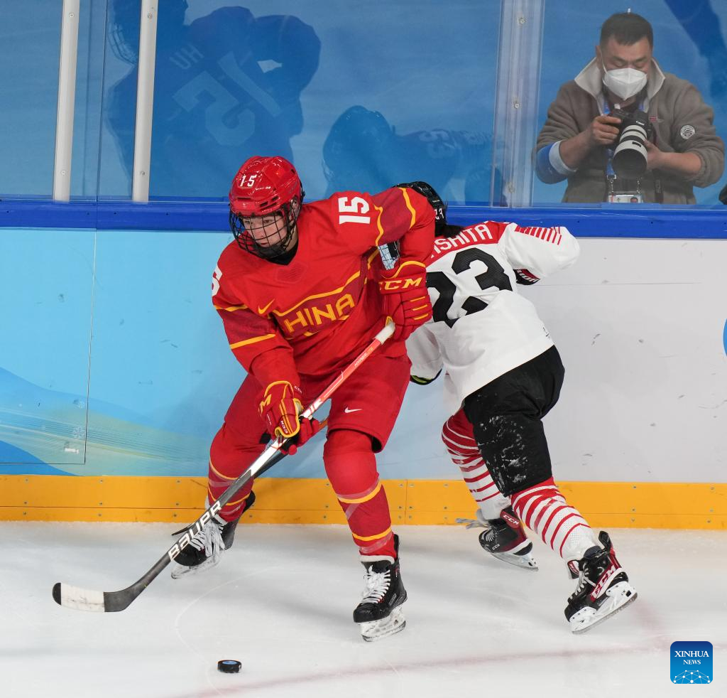 Li Beika (L front) of China vies with Suzuki Sena (R front) of Japan during the women's ice hockey preliminary round Group B match between China and Japan at Wukesong Sports Centre in Beijing, capital of China, Feb. 6, 2022. (Xinhua/Meng Yongmin)