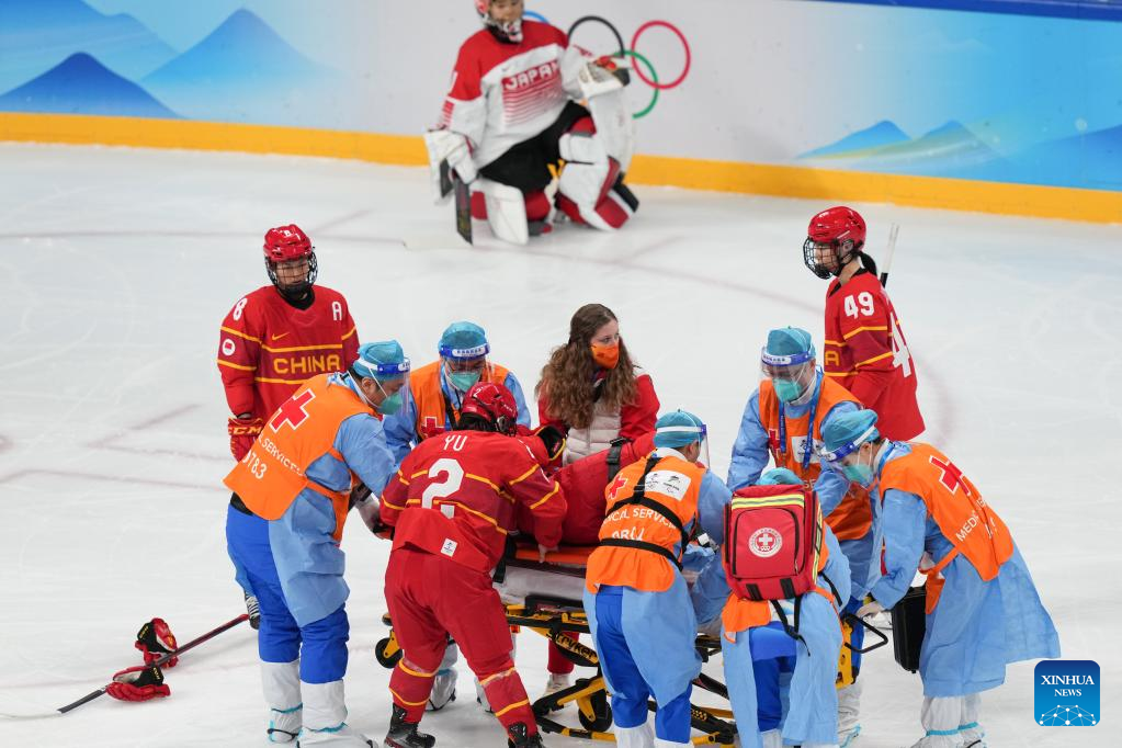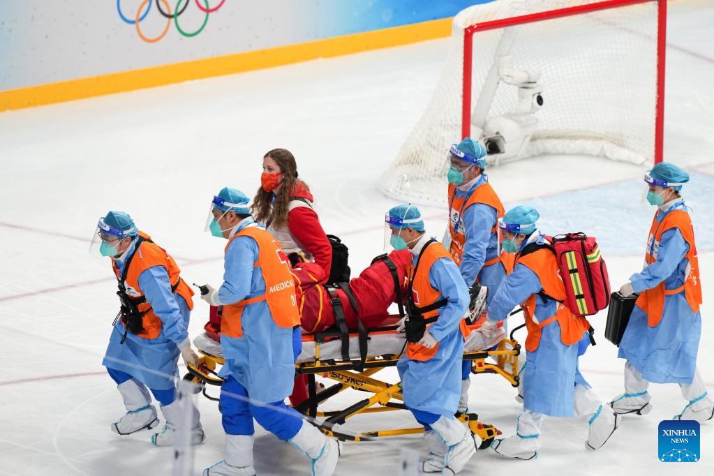 Zhang Mengying (C) of China is carried by medical workers during the ice hockey women's Group B match between China and Japan at Wukesong Sports Centre in Beijing, capital of China, Feb. 6, 2022. (Xinhua/Meng Yongmin)