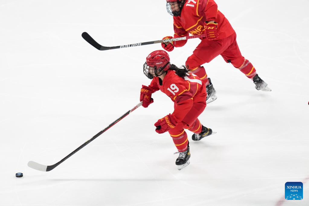 Zhang Xifang (R) of China competes during the ice hockey women's Group B match between China and Japan at Wukesong Sports Centre in Beijing, capital of China, Feb. 6, 2022. (Xinhua/Meng Yongmin)