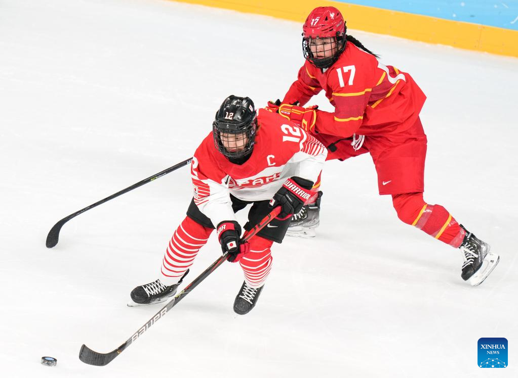 Mi Le (L) of China competes during the ice hockey women's Group B match between China and Japan at Wukesong Sports Centre in Beijing, capital of China, Feb. 6, 2022. (Xinhua/Meng Yongmin)