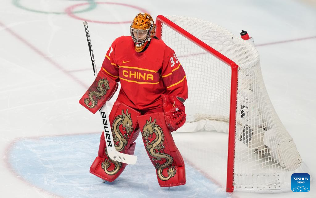 Goalkeeper Zhou Jiaying of China looks on during the ice hockey women's Group B match between China and Japan at Wukesong Sports Centre in Beijing, capital of China, Feb. 6, 2022. (Xinhua/Meng Yongmin)
