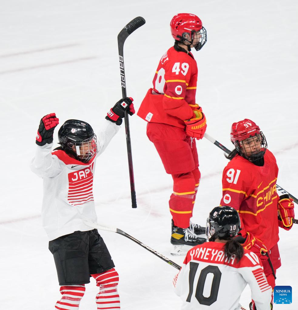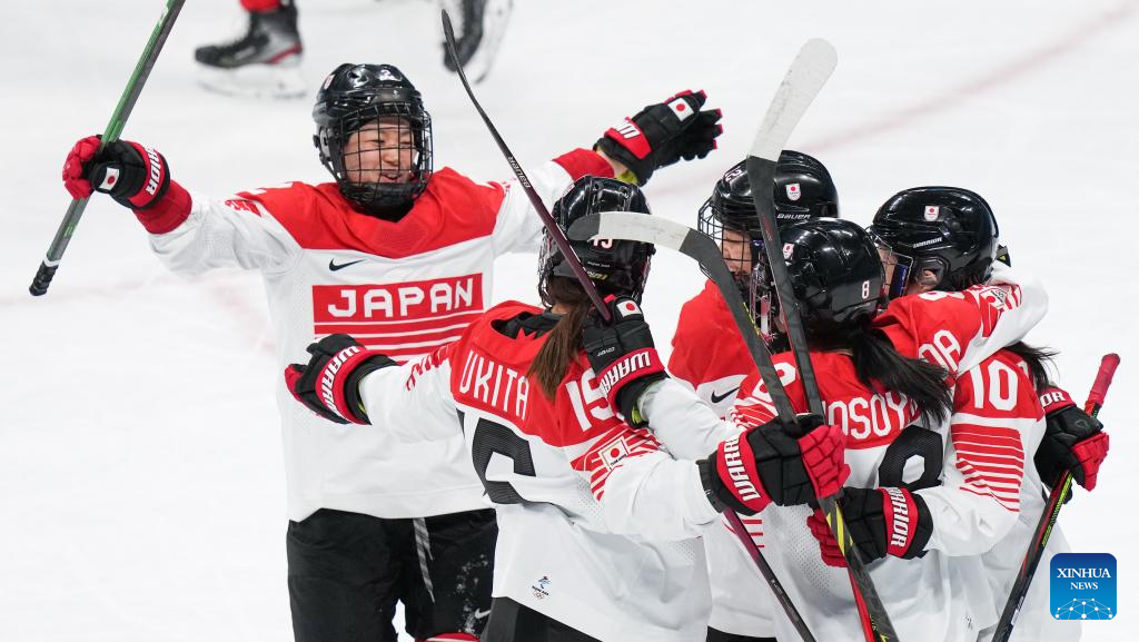 Athletes of Japan celebrate scoring during the women's ice hockey preliminary round Group B match between China and Japan at Wukesong Sports Centre in Beijing, capital of China, Feb. 6, 2022. (Xinhua/Meng Yongmin)