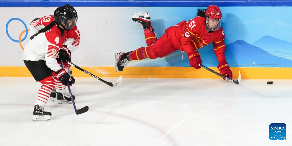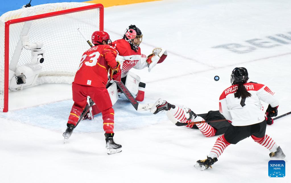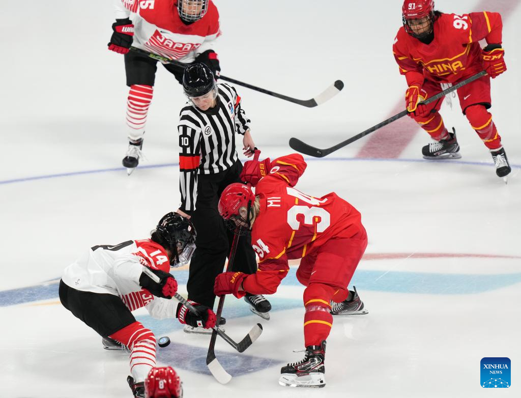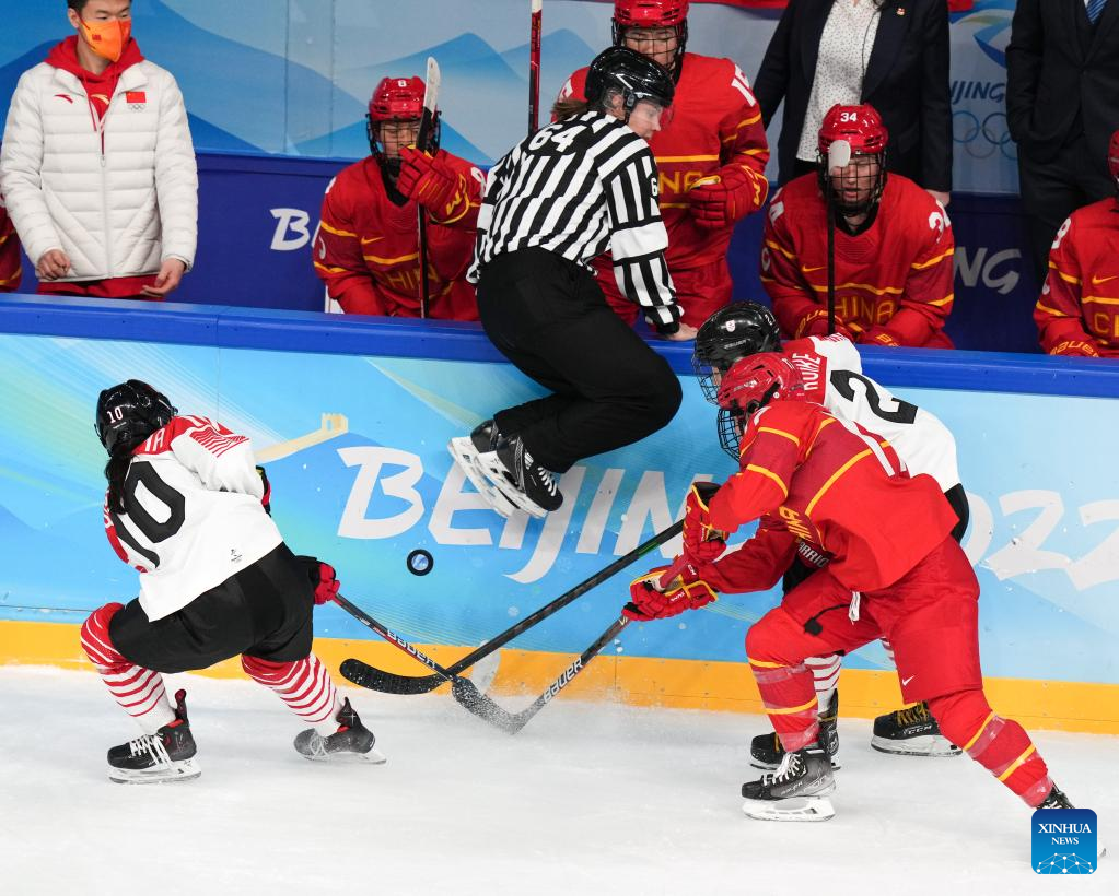 Athletes compete during the ice hockey women's Group B match between China and Japan at Wukesong Sports Centre in Beijing, capital of China, Feb. 6, 2022. (Xinhua/Meng Yongmin)