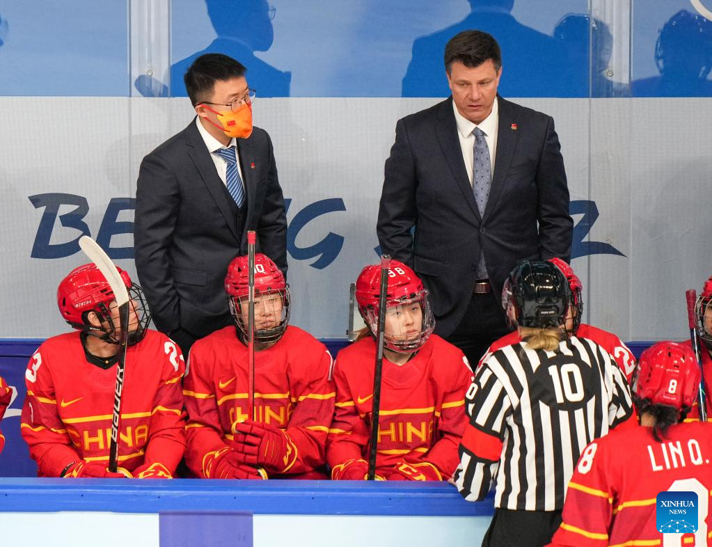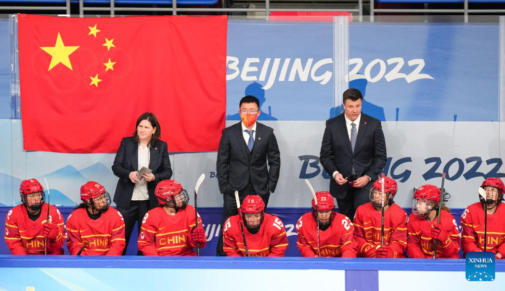 Athletes of China react during the ice hockey women's Group B match between China and Japan at Wukesong Sports Centre in Beijing, capital of China, Feb. 6, 2022. (Xinhua/Meng Yongmin)