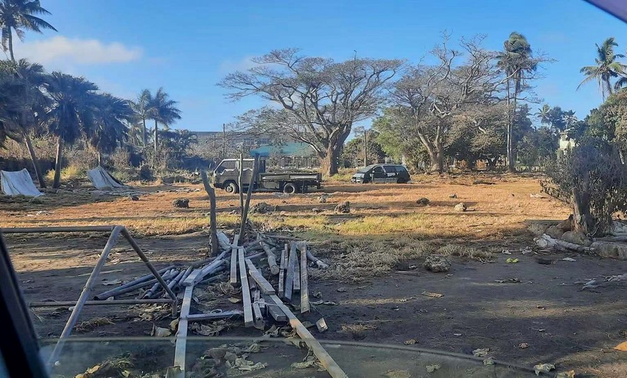 Photo taken on Jan. 20, 2022, shows the view of tsunami-hit Nuku'alofa, capital of Tonga. (Photo by Marian Kupu/Xinhua)