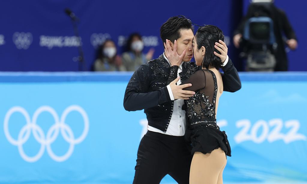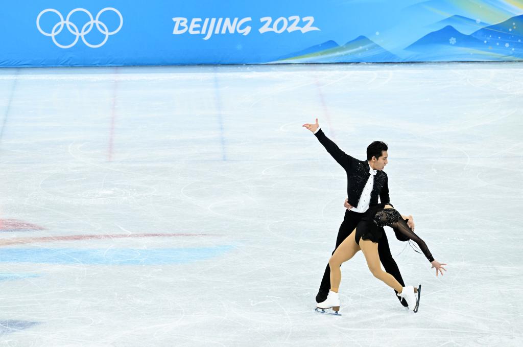 Sui Wenjing (R) /Han Cong of China perform during the figure skating team event ice dance rhythm dance at Capital Indoor Stadium in Beijing, capital of China, Feb. 4, 2022. (Xinhua/Zhang Yuwei)