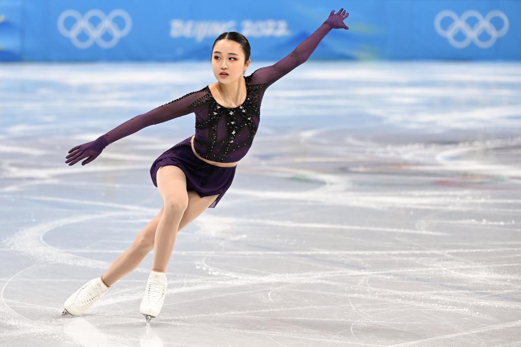 Zhu Yi of China performs during the figure skating team event women's single skating short program match at Capital Indoor Stadium in Beijing, capital of China, Feb. 6, 2022. (Xinhua/Ma Ning)