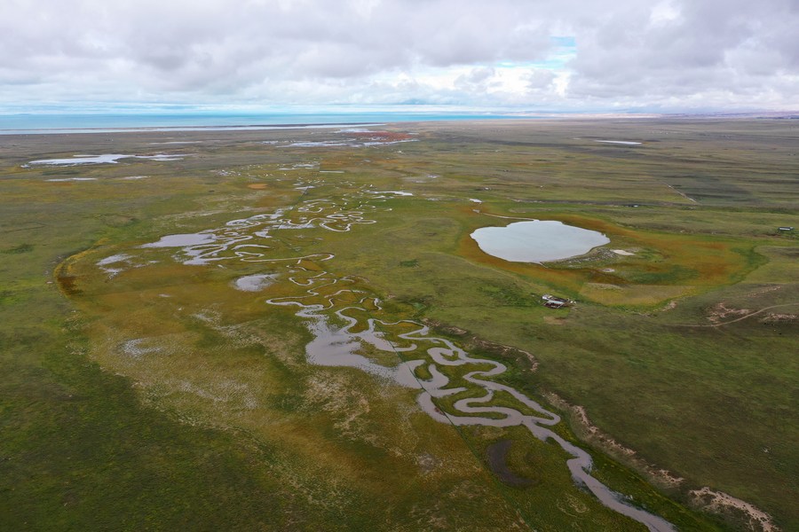 Aerial photo taken on Sept. 15, 2021 shows a river near the Qinghai Lake in northwest China's Qinghai Province. (Xinhua/Xing Guangli)