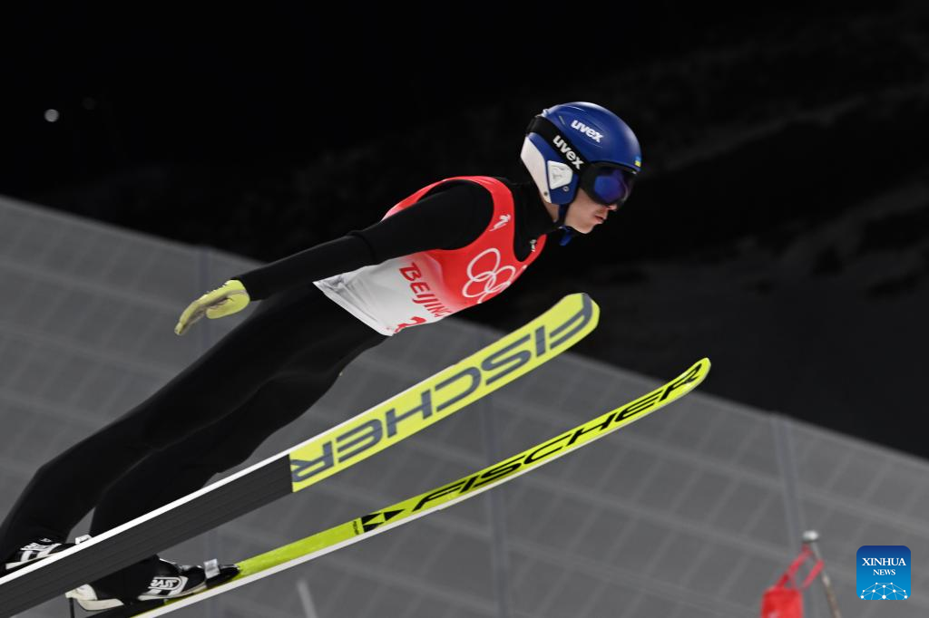 Yevhen Marusiak of Ukraine competes during Ski Jumping Men's Normal Hill Individual 1st Round at the National Ski Jumping Centre in Zhangjiakou, north China's Hebei Province, Feb. 6, 2022. (Xinhua/Feng Kaihua)