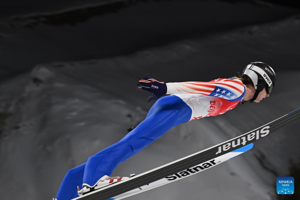 Kevin Bickner of the United States competes during Ski Jumping Men's Normal Hill Individual 1st Round at the National Ski Jumping Centre in Zhangjiakou, north China's Hebei Province, Feb. 6, 2022. (Xinhua/Feng Kaihua)