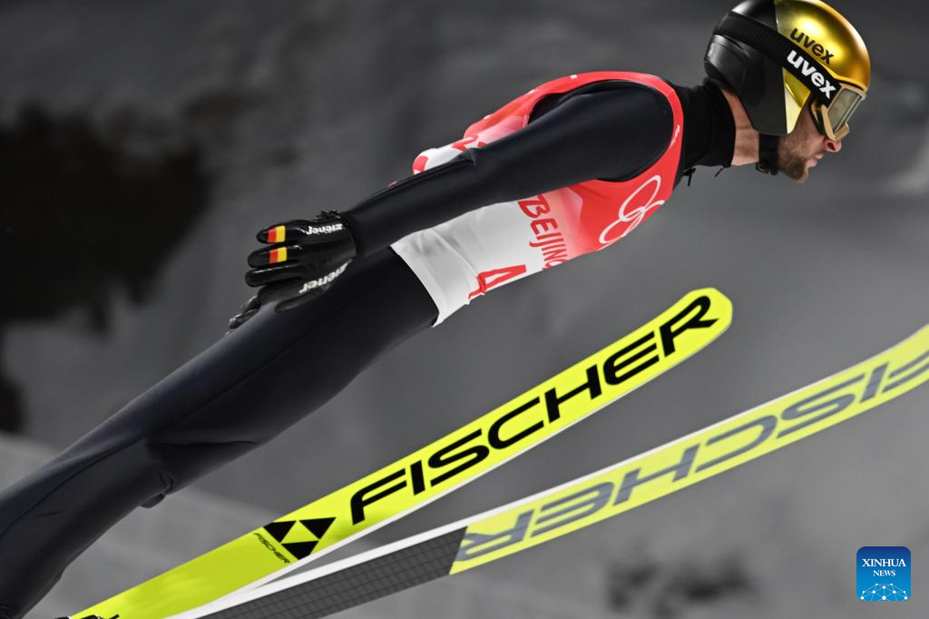 Karl Geiger of Germany competes during Ski Jumping Men's Normal Hill Individual 1st Round at the National Ski Jumping Centre in Zhangjiakou, north China's Hebei Province, Feb. 6, 2022. (Xinhua/Feng Kaihua)