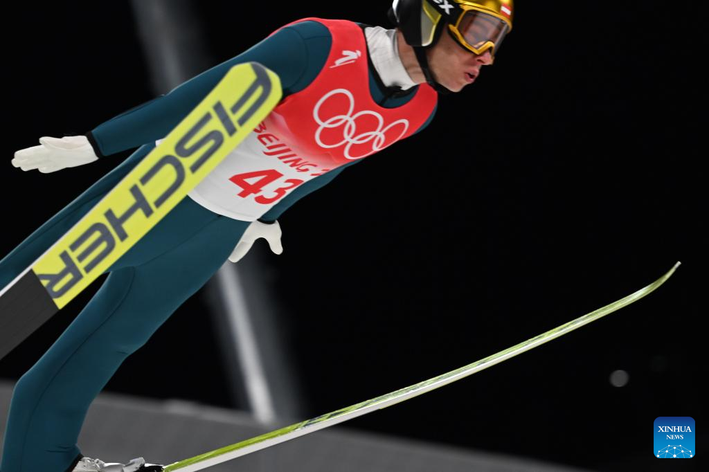 Manuel Fettner of Austria competes during Ski Jumping Men's Normal Hill Individual 1st Round at the National Ski Jumping Centre in Zhangjiakou, north China's Hebei Province, Feb. 6, 2022. (Xinhua/Feng Kaihua)