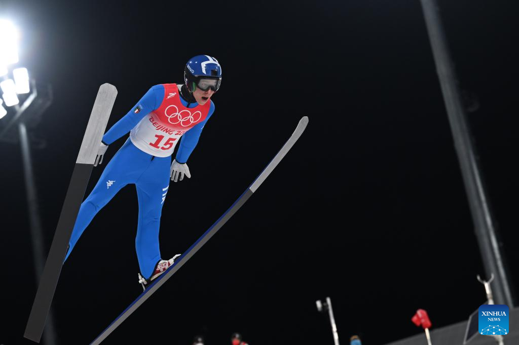 Giovanni Bresadola of Italy competes during Ski Jumping Men's Normal Hill Individual 1st Round at the National Ski Jumping Centre in Zhangjiakou, north China's Hebei Province, Feb. 6, 2022. (Xinhua/Feng Kaihua)