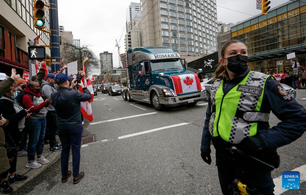 A police officer wearing a face mask is seen on duty during the rally and convoy against COVID-19 vaccine mandate in downtown Vancouver, Canada, Feb. 5, 2022. In solidarity with protesters in downtown Ottawa, anti COVID-19 vaccine mandates and restrictions supporters in Vancouver took part in vehicle convoys and rallies protesting against Canadian government's vaccine mandate for essential workers crossing the Canada-U.S. border. (Photo by Liang Sen/Xinhua)