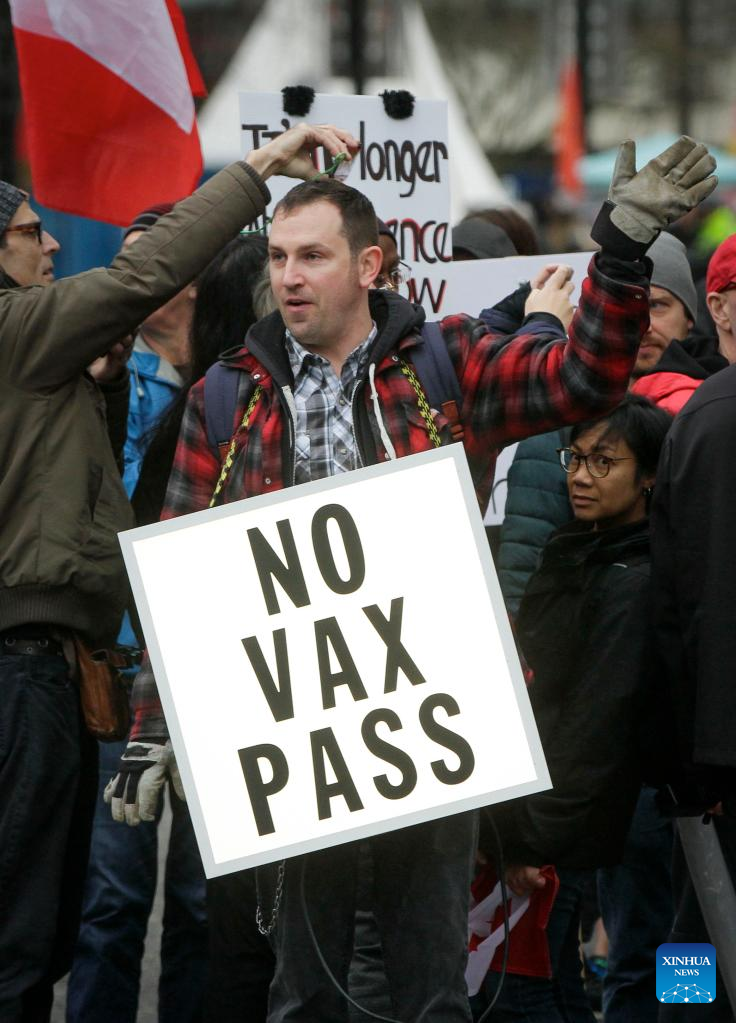A man carries a sign during a convoy of truckers opposed to COVID-19 vaccine mandate in downtown Vancouver, Canada, Feb. 5, 2022. In solidarity with protesters in downtown Ottawa, anti COVID-19 vaccine mandates and restrictions supporters in Vancouver took part in vehicle convoys and rallies protesting against Canadian government's vaccine mandate for essential workers crossing the Canada-U.S. border. (Photo by Liang Sen/Xinhua)
