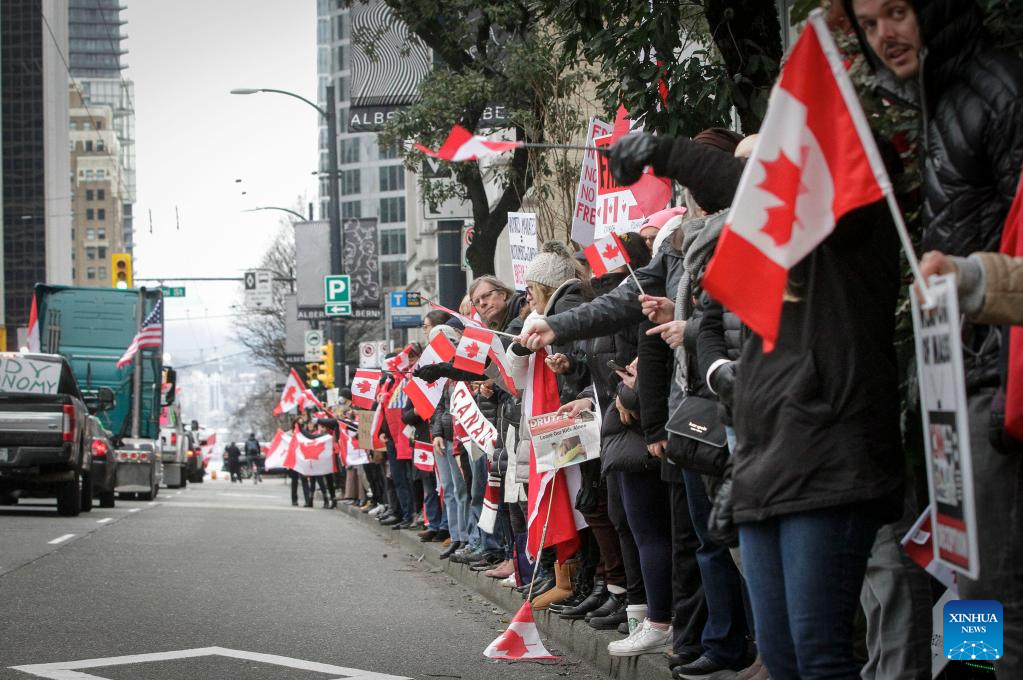 People wave flags as vehicles participate in a convoy to support the truckers against COVID-19 vaccine mandate in downtown Vancouver, Canada, Feb. 5, 2022. In solidarity with protesters in downtown Ottawa, anti COVID-19 vaccine mandates and restrictions supporters in Vancouver took part in vehicle convoys and rallies protesting against Canadian government's vaccine mandate for essential workers crossing the Canada-U.S. border. (Photo by Liang Sen/Xinhua)