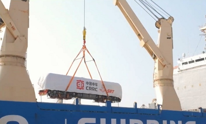 A diesel locomotive manufactured by China Railway Rolling Stock Corporation (CRRC) Qishuyan Co. Ltd unloaded for the handover ceremony in Thailand, Feb. 5, 2022 (State Railway of Thailand/Handout via Xinhua)