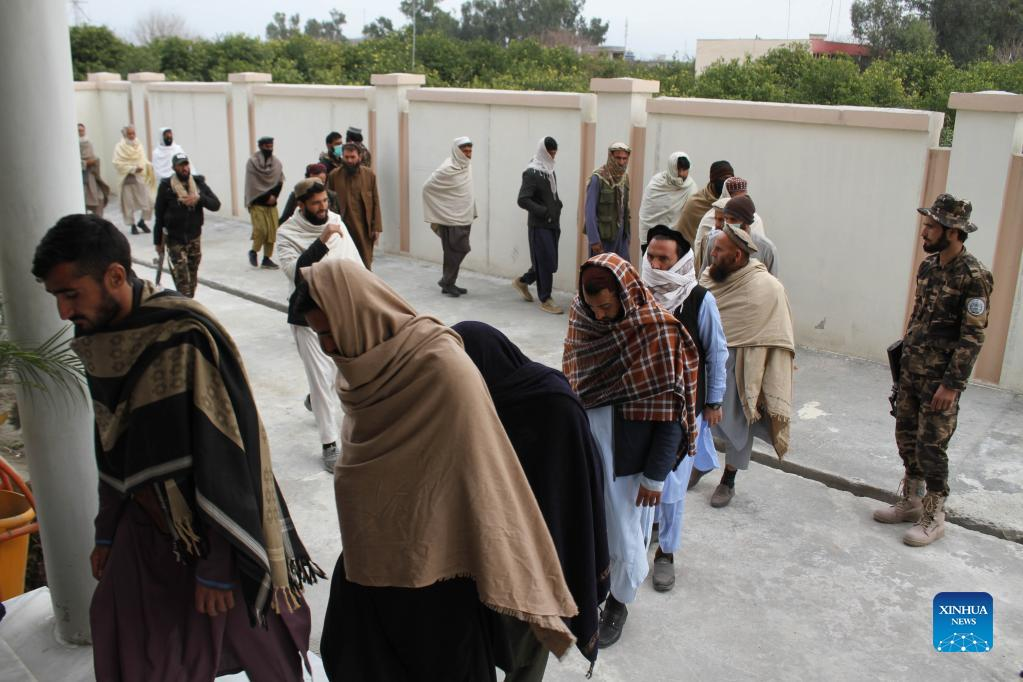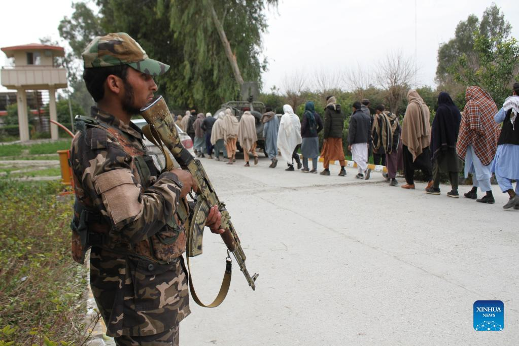 Militants of the Islamic State (IS) terror group surrender to intelligence authorities in Nangarhar, Afghanistan, Feb. 6, 2022. Fifty affiliated militants of the Islamic State (IS) terror group surrendered in eastern Afghanistan's Nangarhar province, a provincial official said on Sunday. (Photo by Hamidullah/Xinhua)