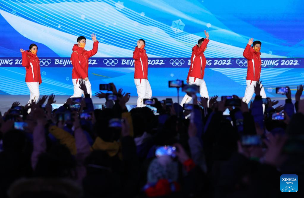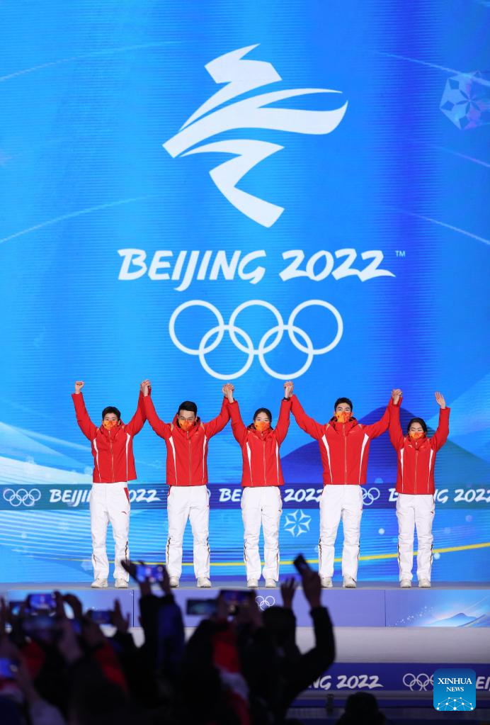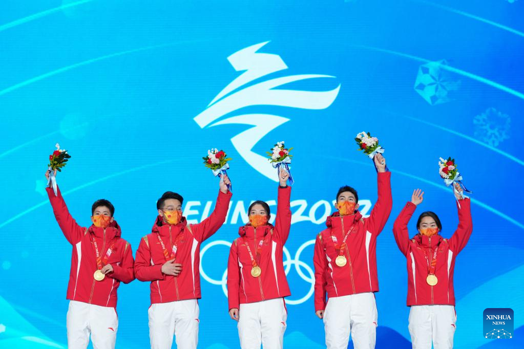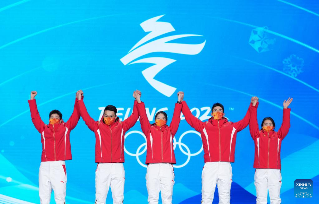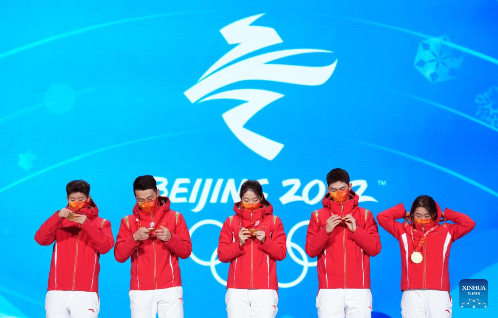 Athletes of China attend the awarding ceremony of the mixed team relay of short track speed skating event at the Beijing Medals Plaza of the Winter Olympics in Beijing, capital of China, Feb. 6, 2022.China won the gold medal in the event. (Xinhua/Yang Lei)