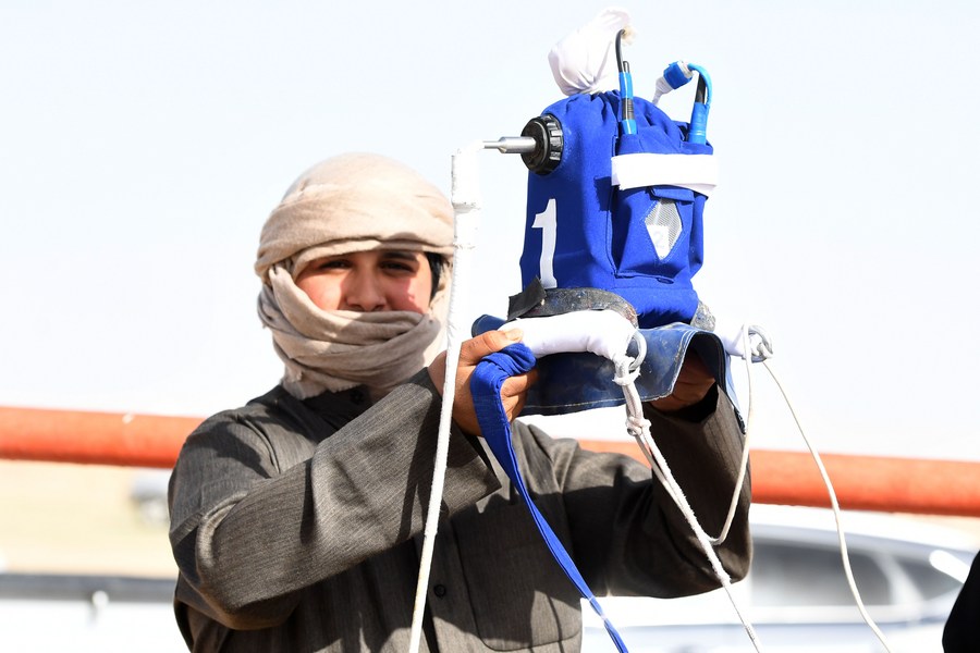 A camel competes in the 20th International Camel Racing Championship with a robot jockey on its back in Ahmadi Governorate, Kuwait, Feb. 5, 2022. (Ghazy Qaffaf/Xinhua)