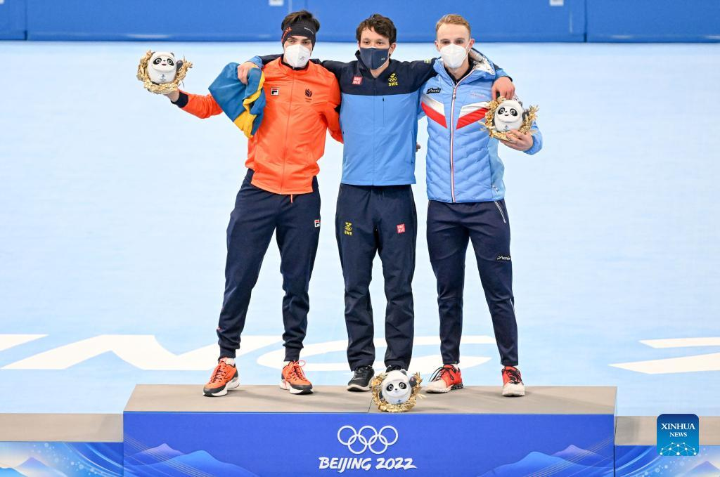 Gold medalist Nils van der Poel (C) of Sweden, silver medalist Patrick Roest (L) of the Netherlands, and bronze medalist Hallgeir Engebraaten of Norway celebrate at the flower ceremony after the men's 5,000m final of speed skating at the National Speed Skating Oval in Beijing, capital of China, Feb. 6, 2022. (Xinhua/Wang Fei)