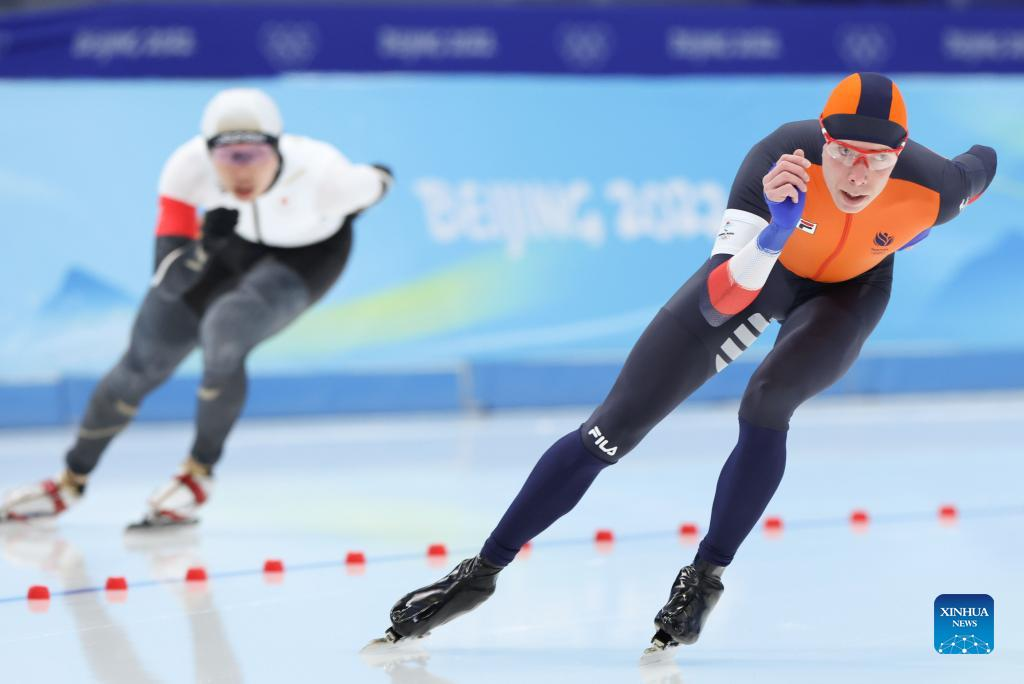 Jorrit Bergsma (R) of the Netherlands competes during the men's 5,000m final of speed skating at the National Speed Skating Oval in Beijing, capital of China, Feb. 6, 2022. (Xinhua/Cheng Tingting)