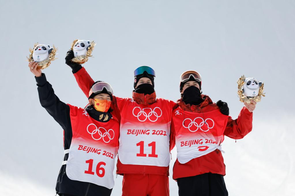 Su Yiming (L) of China, Max Parrot (C) and Mark McMorris of Canada pose during the flower ceremony after men's snowboard slopestyle final at the Genting Snow Park in Zhangjiakou, north China's Hebei Province, Feb. 7, 2022. (Xinhua/Fei Maohua)