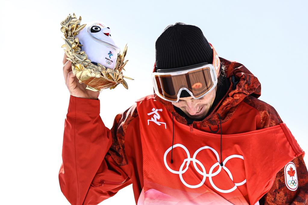 Canada's Mark McMorris reacts during the flower ceremony after men's snowboard slopestyle final at the Genting Snow Park in Zhangjiakou, north China's Hebei Province, Feb. 7, 2022. (Xinhua/Wu Zhuang)