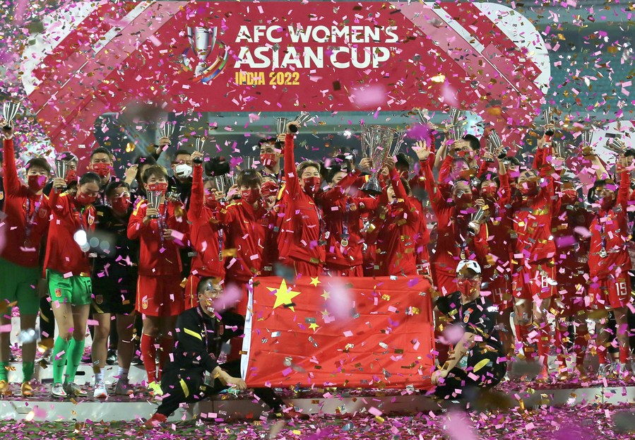 Members of China celebrate during the awarding ceremony after winning the final football match between China and South Korea at the 2022 AFC Women's Asian Cup in Mumbai, India, Feb. 6, 2022. (Xinhua/Javed Dar)