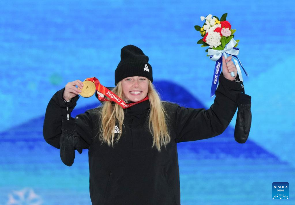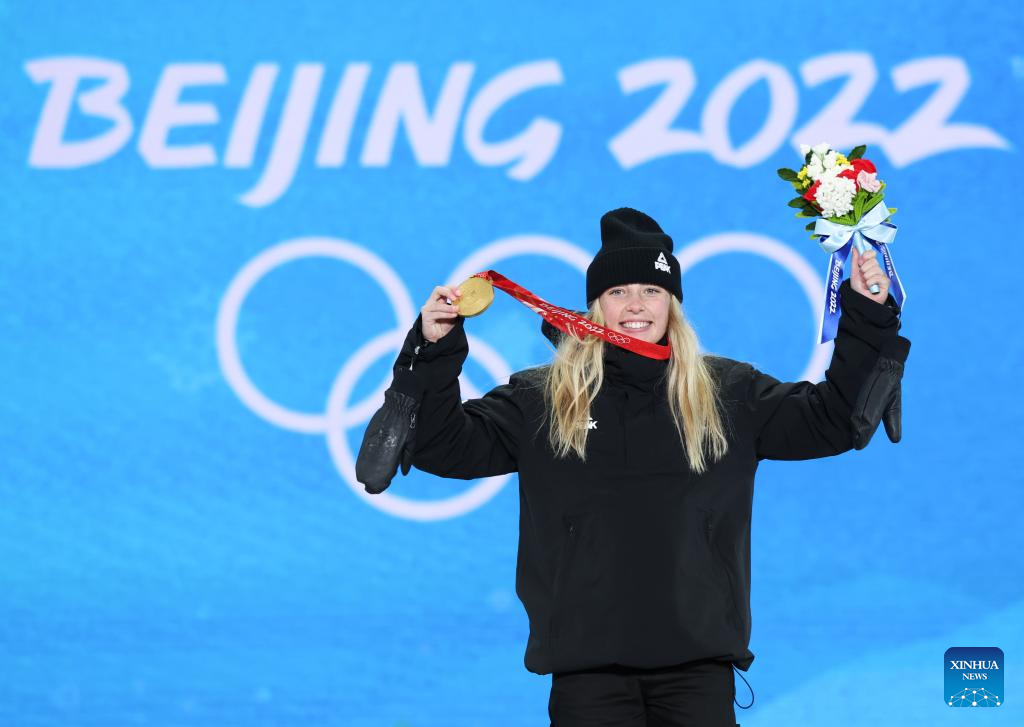 Gold medalist Zoi Sadowski Synnott of New Zealand poses for a photo during the awarding ceremony of Women's Snowboard Slopestyle at the Zhangjiakou Medals Plaza of the Winter Olympics in Zhangjiakou, north China's Hebei Province, Feb. 6, 2022. (Xinhua/Peng Ziyang)