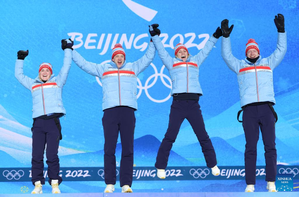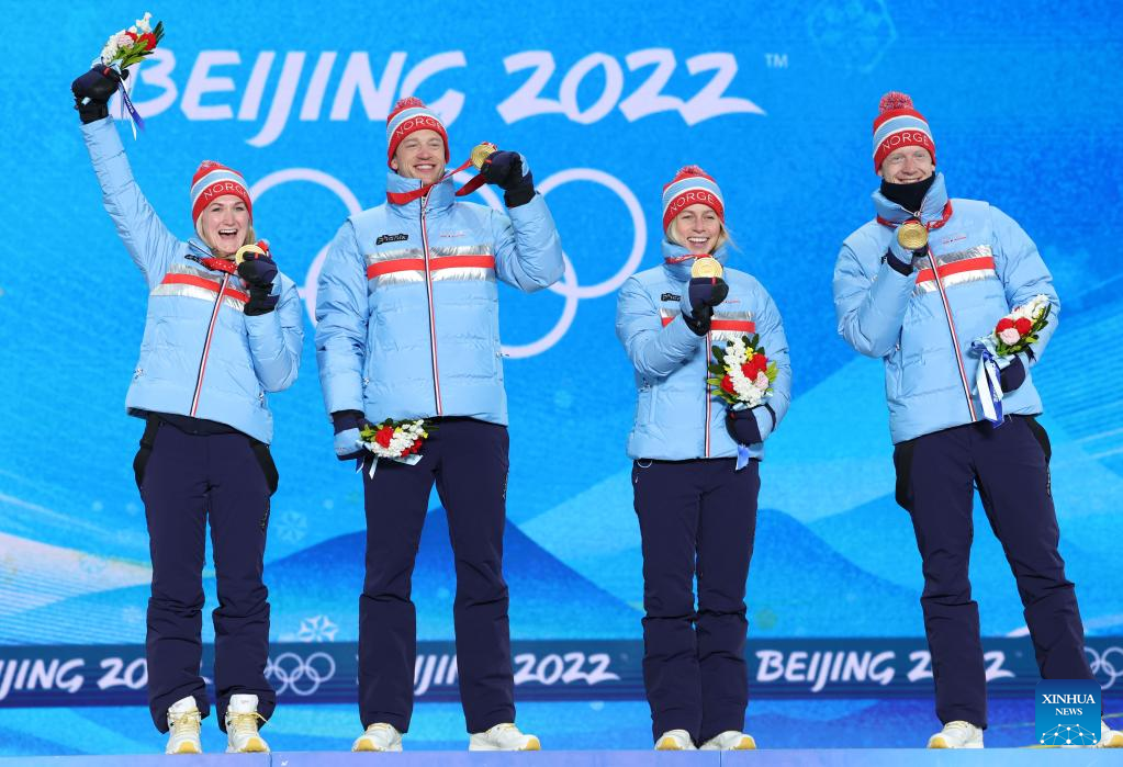Gold medalists Marte Olsbu Roeiseland, Tarjei Boe, Tiril Eckhoff and Johannes Thingnes Boe (from L to R) of Norway pose for a photo during the awarding ceremony of the biathlon 4X6km Women+Men mixed relay at the Zhangjiakou Medals Plaza of the Winter Olympics in Zhangjiakou, north China's Hebei Province, Feb. 6, 2022. (Xinhua/Ding Ting)