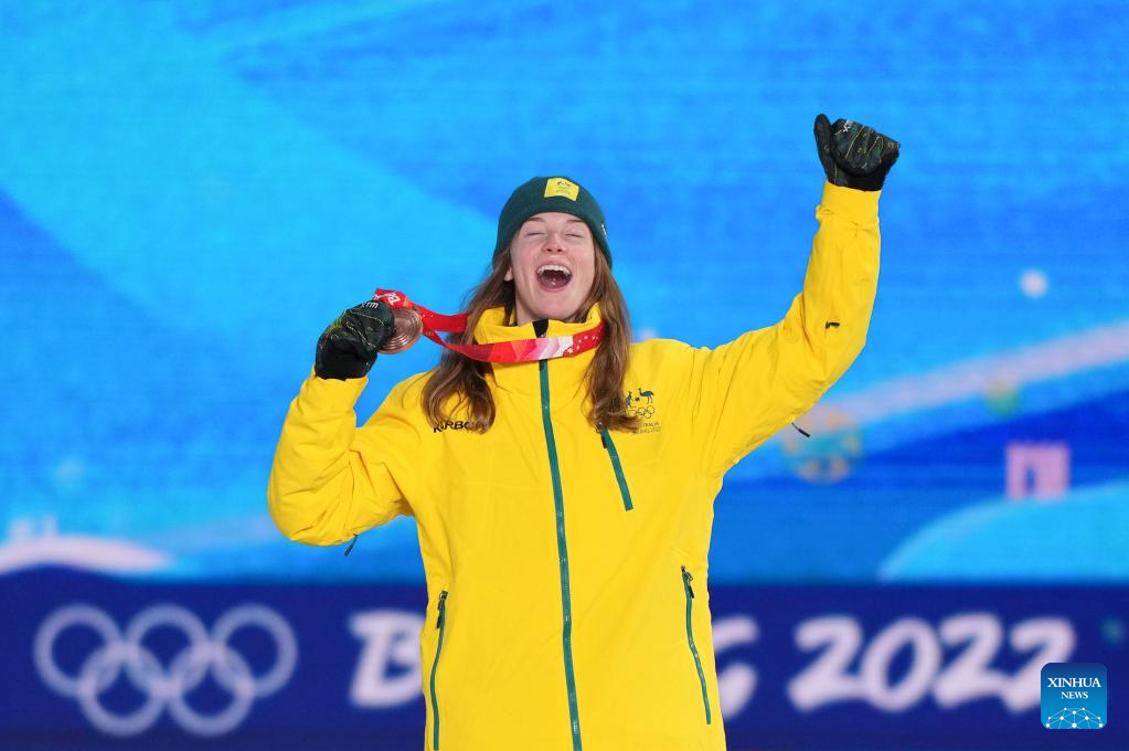 Bronze medalist Tess Coady of Australia poses for a photo during the awarding ceremony of Women's Snowboard Slopestyle at the Zhangjiakou Medals Plaza of the Winter Olympics in Zhangjiakou, north China's Hebei Province, Feb. 6, 2022. (Xinhua/Peng Ziyang)