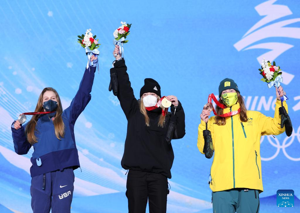 Gold medalist Zoi Sadowski Synnott of New Zealand (C), silver medalist Julia Marino of the United States (L) and bronze medalist Tess Coady of Australia pose for a photo during the awarding ceremony of Women's Snowboard Slopestyle at the Zhangjiakou Medals Plaza of the Winter Olympics in Zhangjiakou, north China's Hebei Province, Feb. 6, 2022. (Xinhua/Ding Ting)