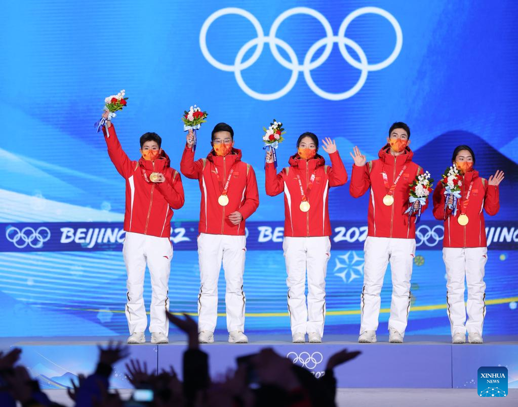 Gold medalists Fan Kexin (1st L), Ren Ziwei (2nd L), Qu Chunyu (C), Wu Dajing (2nd R) and Zhang Yuting of China pose for a photo during the awarding ceremony of the mixed team relay of short track speed skating event at the Beijing Medals Plaza of the Winter Olympics in Beijing, capital of China, Feb. 6, 2022. (Xinhua/Yang Lei)