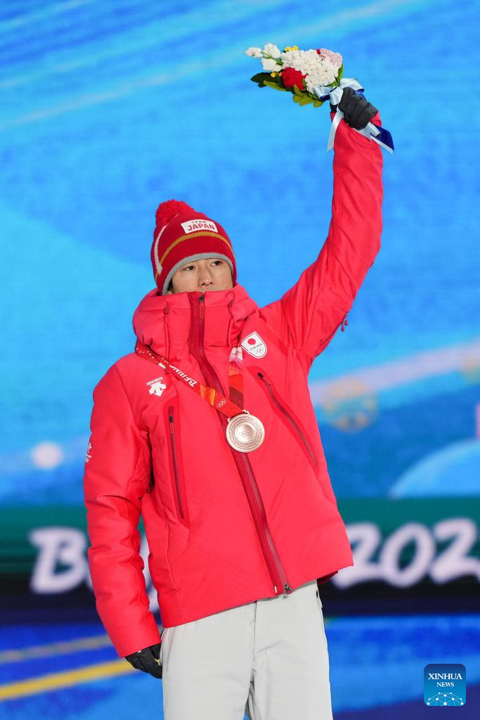 Bronze medalist Ikuma Horishima of Japan poses for a photo during the awarding ceremony of Free Style Skiing Men's Moguls at the Zhangjiakou Medals Plaza of the Winter Olympics in Zhangjiakou, north China's Hebei Province, Feb. 6, 2022. (Xinhua/Peng Ziyang)