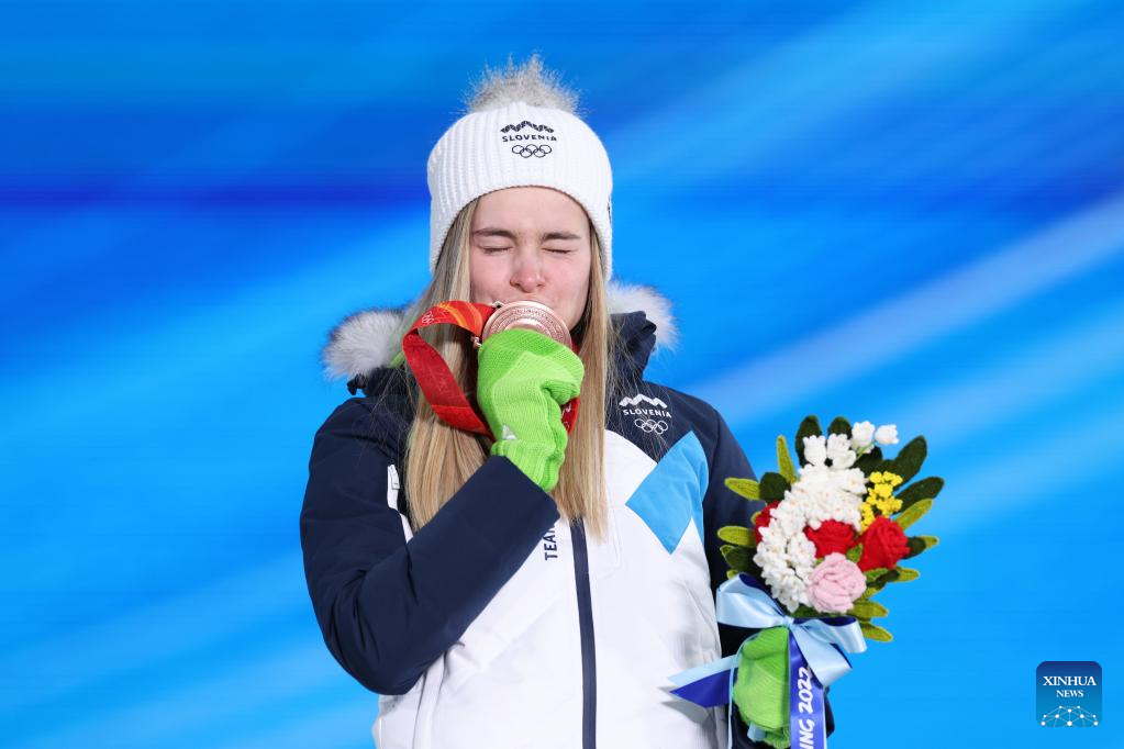 Bronze medalist Nika Kriznar of Slovenia kisses her medal during the awarding ceremony of the Ski Jumping Women's Normal Hill Individual at the Zhangjiakou Medals Plaza of the Winter Olympics in Zhangjiakou, north China's Hebei Province, Feb. 6, 2022. (Xinhua/Ding Ting)