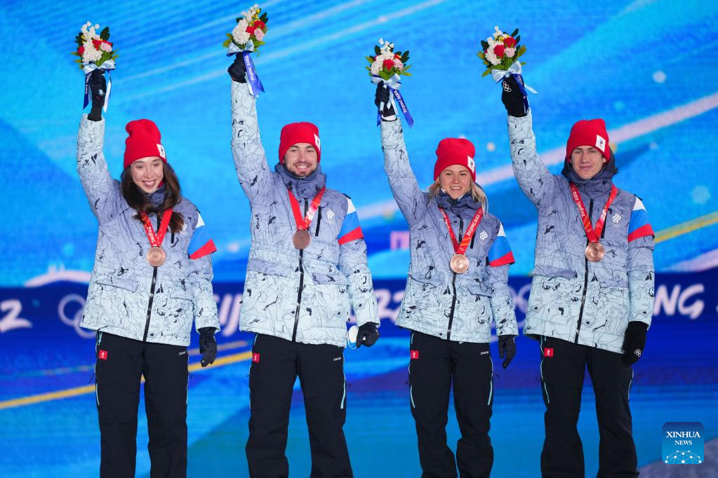 Bronze medalists Uliana Nigmatullina, Alexander Loginov, Kristina Reztsova and Eduard Latypov (from L to R) of the Russian Olympic Committee pose for a photo during the awarding ceremony of the biathlon 4X6km Women+Men mixed relay at the Zhangjiakou Medals Plaza of the Winter Olympics in Zhangjiakou, north China's Hebei Province, Feb. 6, 2022. (Xinhua/Peng Ziyang)