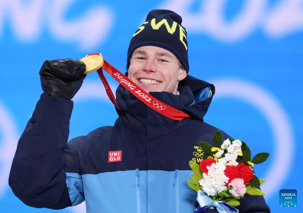 Gold medalist Walter Wallberg of Sweden poses for a photo during the awarding ceremony of Free Style Skiing Men's Moguls at the Zhangjiakou Medals Plaza of the Winter Olympics in Zhangjiakou, north China's Hebei Province, Feb. 6, 2022. (Xinhua/Ding Ting)