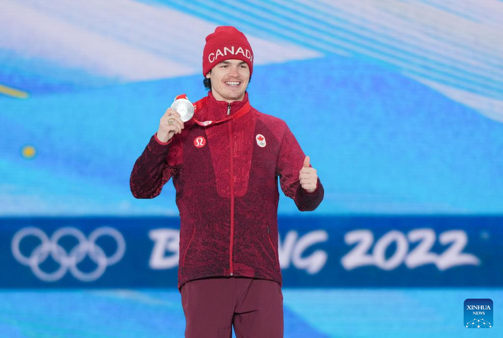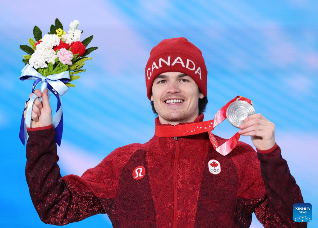 Silver medalist Mikael Kingsbury of Canada poses for a photo during the awarding ceremony of Free Style Skiing Men's Moguls at the Zhangjiakou Medals Plaza of the Winter Olympics in Zhangjiakou, north China's Hebei Province, Feb. 6, 2022. (Xinhua/Ding Ting)