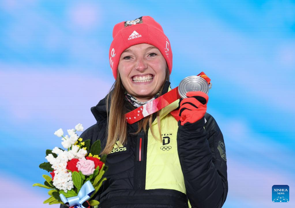 Silver medalist Katharina Althaus of Germany poses for a photo during the awarding ceremony of the Ski Jumping Women's Normal Hill Individual at the Zhangjiakou Medals Plaza of the Winter Olympics in Zhangjiakou, north China's Hebei Province, Feb. 6, 2022. (Xinhua/Ding Ting)