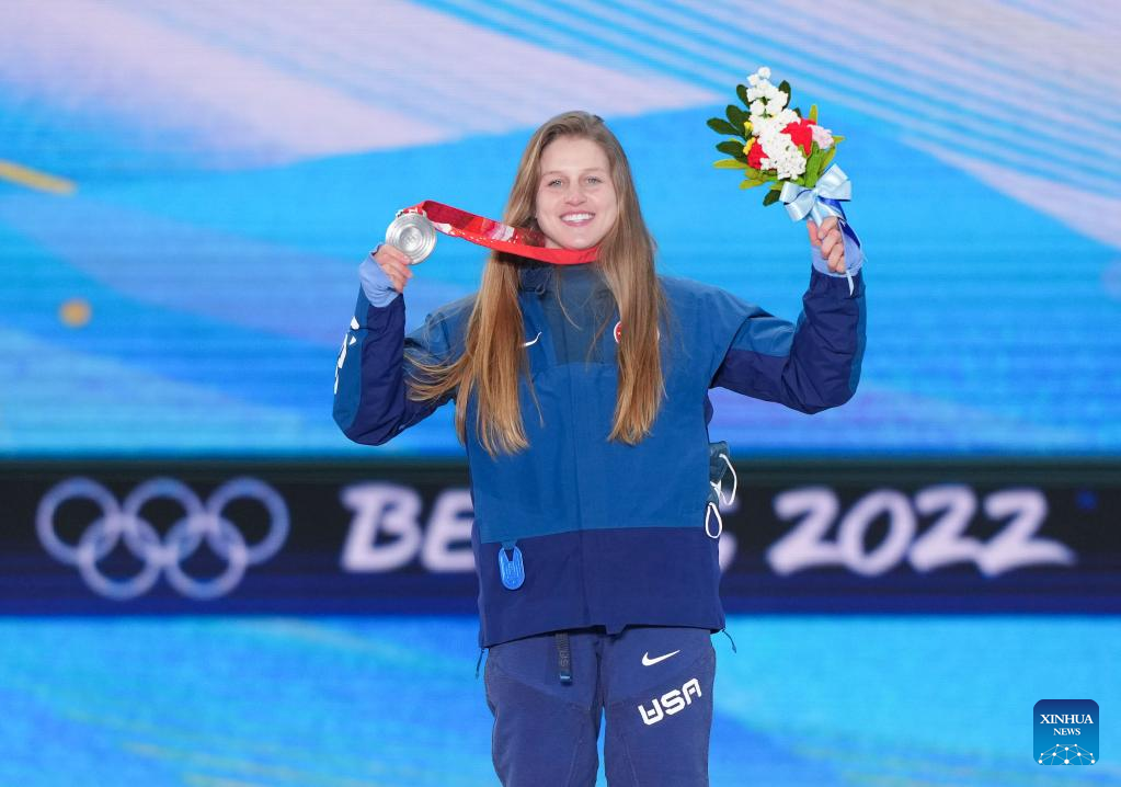 Silver medalist Julia Marino of the United States poses for a photo during the awarding ceremony of Women's Snowboard Slopestyle at the Zhangjiakou Medals Plaza of the Winter Olympics in Zhangjiakou, north China's Hebei Province, Feb. 6, 2022. (Xinhua/Peng Ziyang)