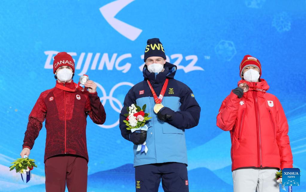 Gold medalist Walter Wallberg (C) of Sweden, silver medalist Mikael Kingsbury (L) of Canada and bronze medalist Horishima Ikuma of Japan pose for a photo during the awarding ceremony of Free Style Skiing Men's Moguls at the Zhangjiakou Medals Plaza of the Winter Olympics in Zhangjiakou, north China's Hebei Province, Feb. 6, 2022. (Xinhua/Ding Ting)