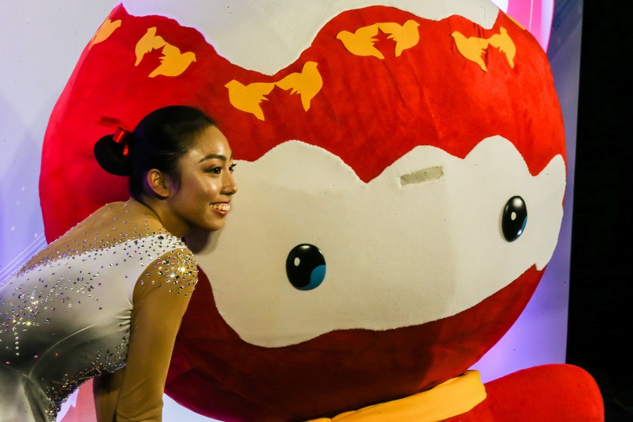 Skye Frances Patenia poses with the mascot Shuey Rhon Rhon during the virtual send-off to the Philippine Olympic delegation for the upcoming 2022 Beijing Winter Olympics in Pasay City, the Philippines, on Jan. 22, 2022. (Xinhua/Rouelle Umali) ■