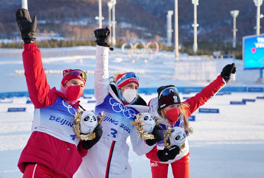Gold medalist Therese Johaug (C) of Norway, silver medalist Natalia Nepryaeva (L) of ROC and bronze medalist Teresa Stadlober of Austria celebrate after the Cross-Country Skiing Women's 7.5km + 7.5km Skiathlon at National Cross-Country Skiing Centre in Zhangjiakou, north China's Hebei Province, on Feb. 5, 2022. (Xinhua/Mu Yu)